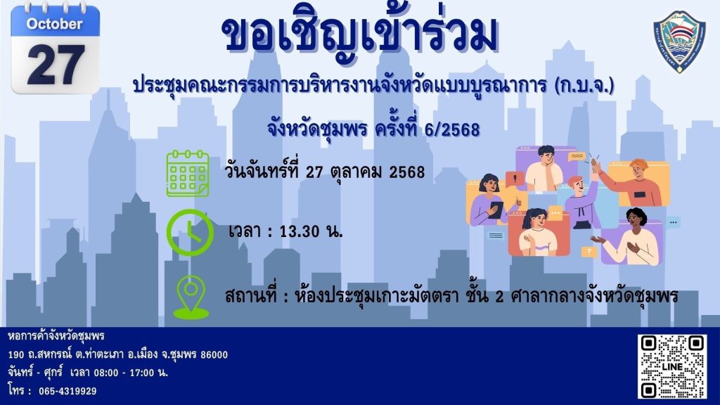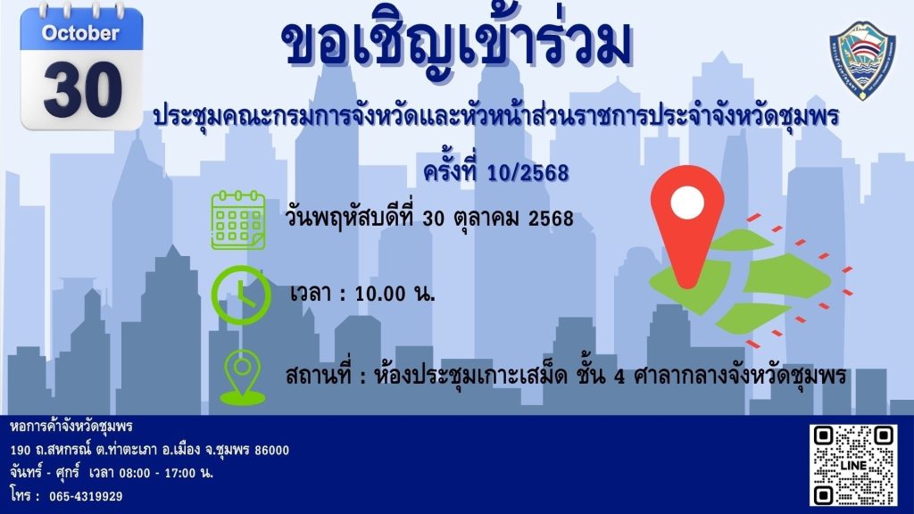 วันที่ 9 ตุลาคม 2568 เวลา 13.30 น. นายจาฎุพจน์ ไกรมาก ประธานหอการค้าจังหวัดชุมพร ร่วมประชุมวิสามัญ ครั้งที่ 1/2568 โดยมีนายอภิชาติ สาราบรรณ์ รองผู้ว่าราชการจังหวัดชุมพรเป็นประธาน ณ ห้องประชุมเกาะพิทักษ์ ชั้น 3 ศาลากลางจังหวัด ชุมพร เพื่อพิจารณาแต่งตั้งคณะกรรมการมูลนิธิฯ กองทุนช่วยเหลือผู้ประสบภัยพิบัติจังหวัดชุมพร การแต่งตั้งอนุกรรมการพิจารณา กลั่นกรองเงินยืม และปรับปรุงแก้ไขตราสารระเบียบมูลนิธิกองทุนช่วยเหลือผู้ประสบภัยพิบัติจังหวัดชุมพร และสรุปผลการดาเนินงาน ของมูลนิธิ ประจาปีงบประมาณ 2568